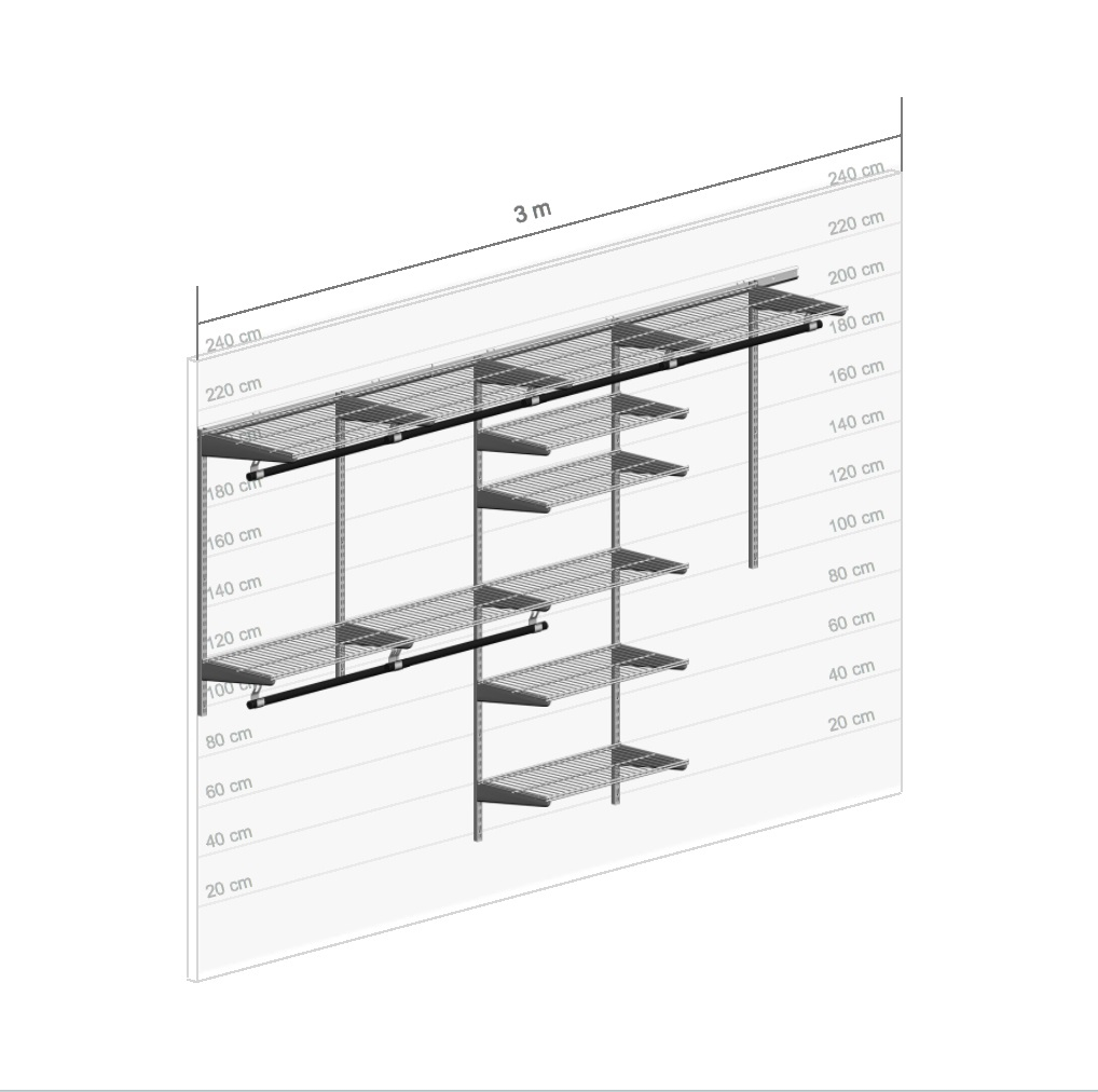 Базовый комплект гардеробной системы GS - это готовое решение для квартиры, дачи, гаража, обеспечивающее удобное хранение вещей. Система собирается в 6 разных конфигурациях, что позволяет подстраивать ее под размеры помещения и ориентироваться на личные пожелания по расположению отдельных элементов. В комплект входят несущие рельсы и навесные направляющие, полки, штанги, аксессуары, крепежные элементы. Можно докупить множество дополнительных компонентов для гардеробной системы.