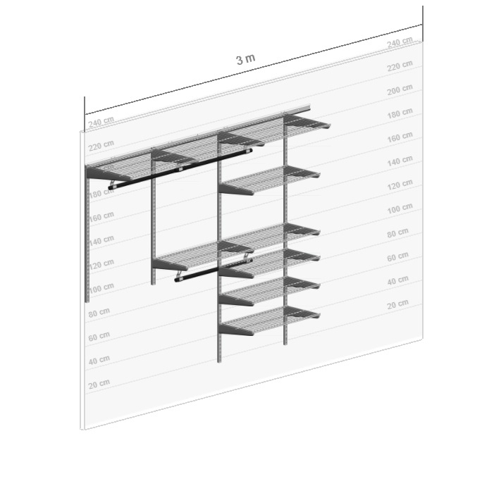 В комплект входят несущие рельсы и навесные направляющие, полки, штанги, аксессуары, крепежные элементы. Можно докупить множество дополнительных компонентов для гардеробной системы.