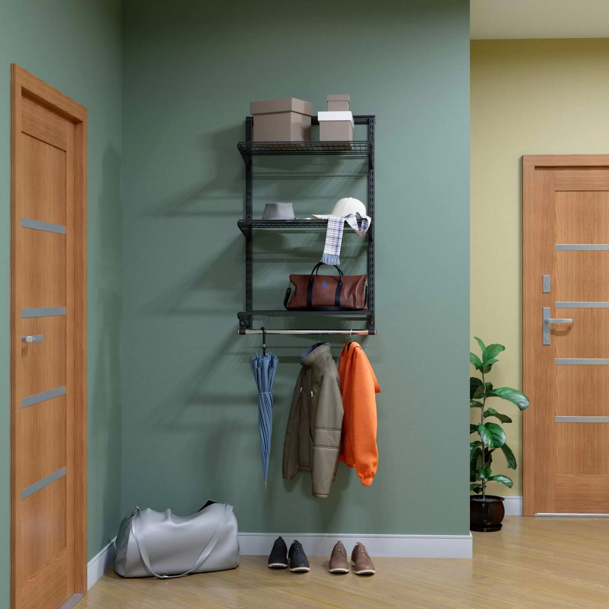 В комплект входят несущие рельсы и навесные направляющие, полки, штанги, аксессуары, крепежные элементы. Можно докупить множество дополнительных компонентов для гардеробной системы.