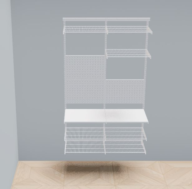 В комплект входят несущие рельсы и навесные направляющие, полки, штанги, аксессуары, крепежные элементы. Можно докупить множество дополнительных компонентов для гардеробной системы.