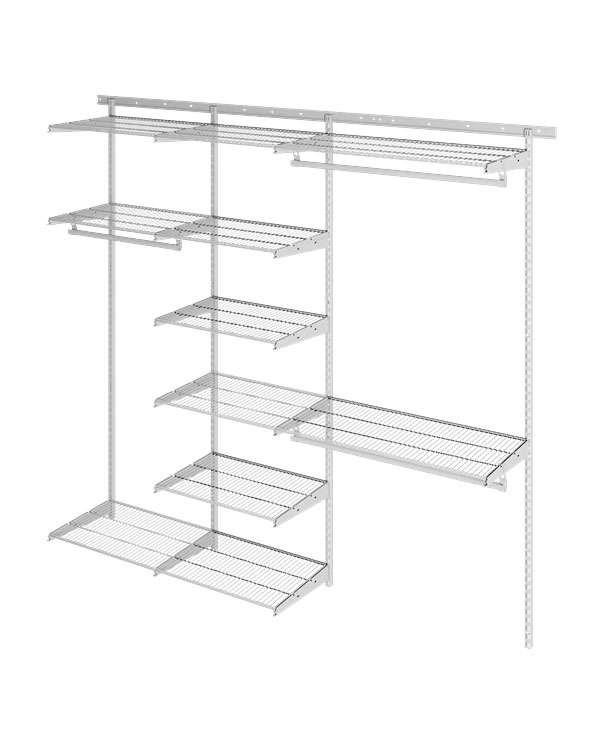 В комплект входят несущие рельсы и навесные направляющие, полки, штанги, аксессуары, крепежные элементы. Можно докупить множество дополнительных компонентов для гардеробной системы.
