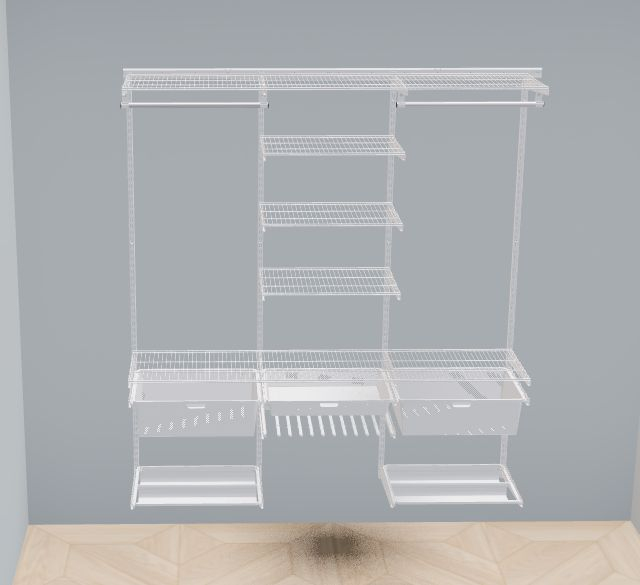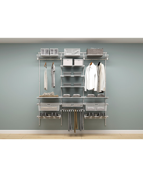 В комплект входят несущие рельсы и навесные направляющие, полки, штанги, аксессуары, крепежные элементы. Можно докупить множество дополнительных компонентов для гардеробной системы.