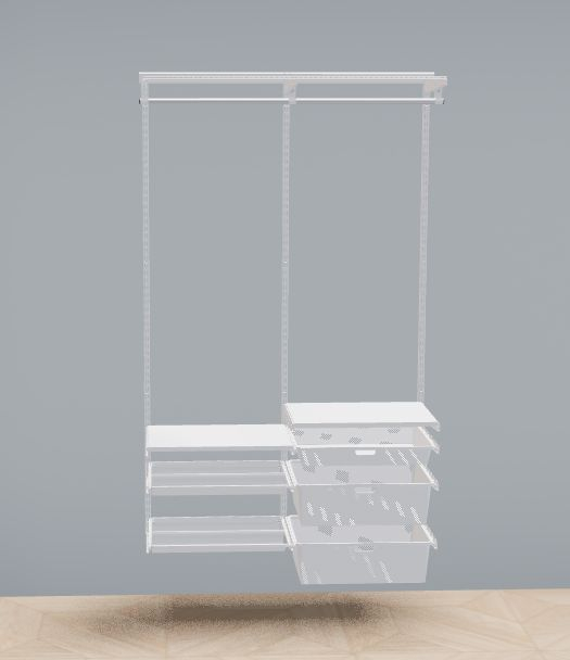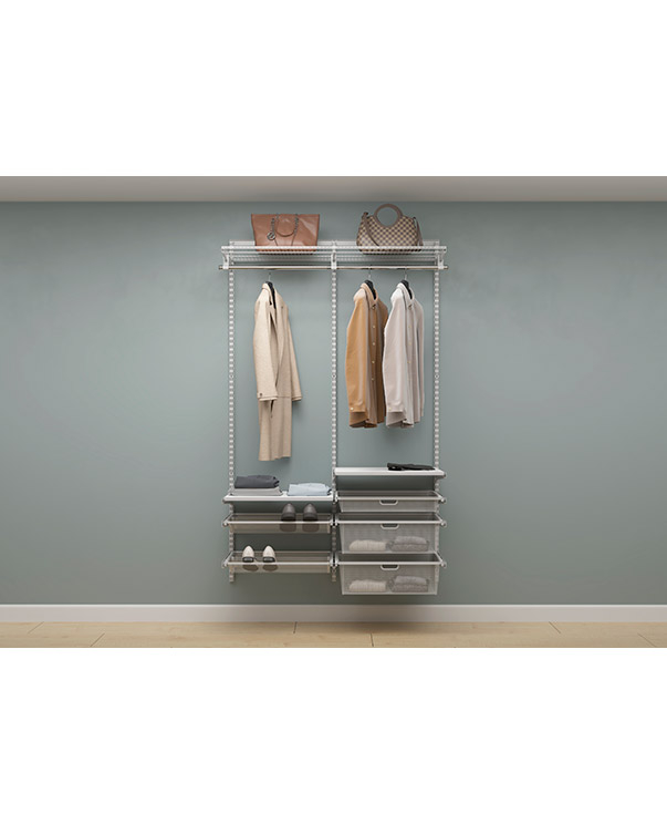 В комплект входят несущие рельсы и навесные направляющие, полки, штанги, аксессуары, крепежные элементы. Можно докупить множество дополнительных компонентов для гардеробной системы.