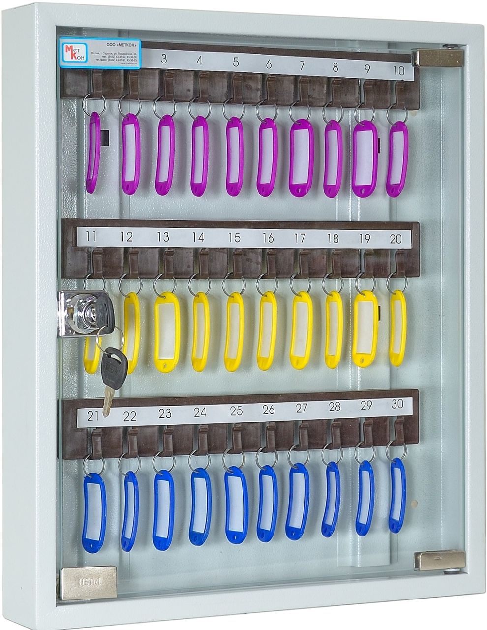 Ключница КЛ-30С предназначена для хранения 30 комплектов ключей. Лицевая панель — стекло мебельное. На задней стенке корпуса расположены отверстия для крепления. Ключница комплектуется 3 планками под навеску ключей. В дверь установлен замок типа «Cam-Lock».