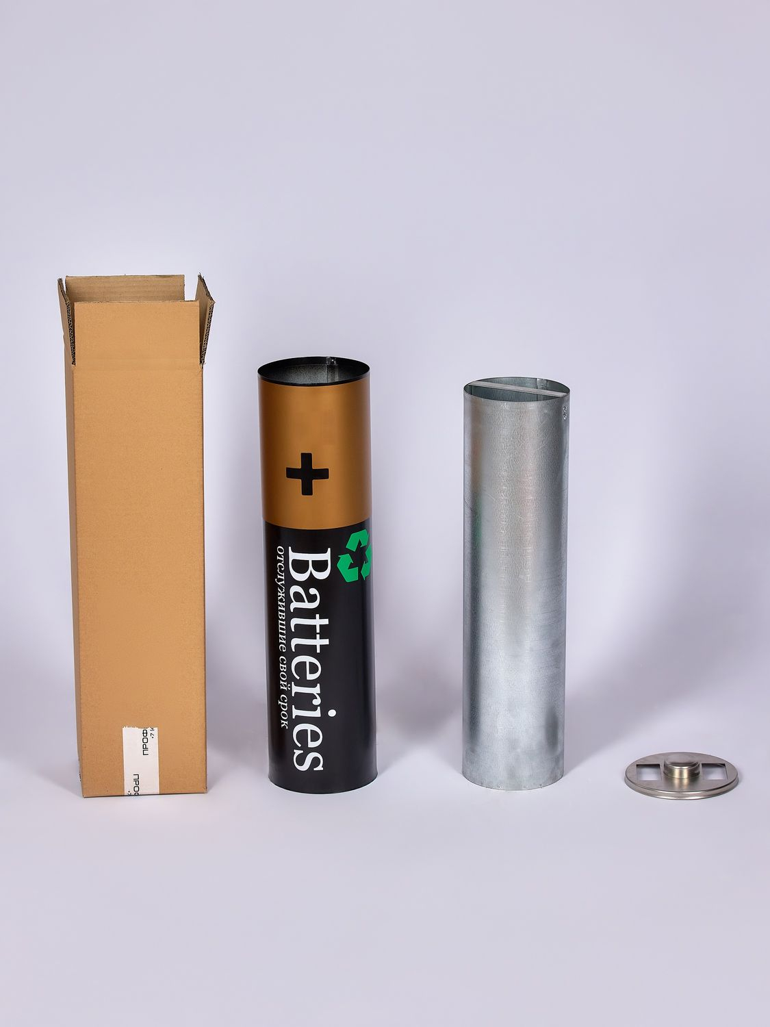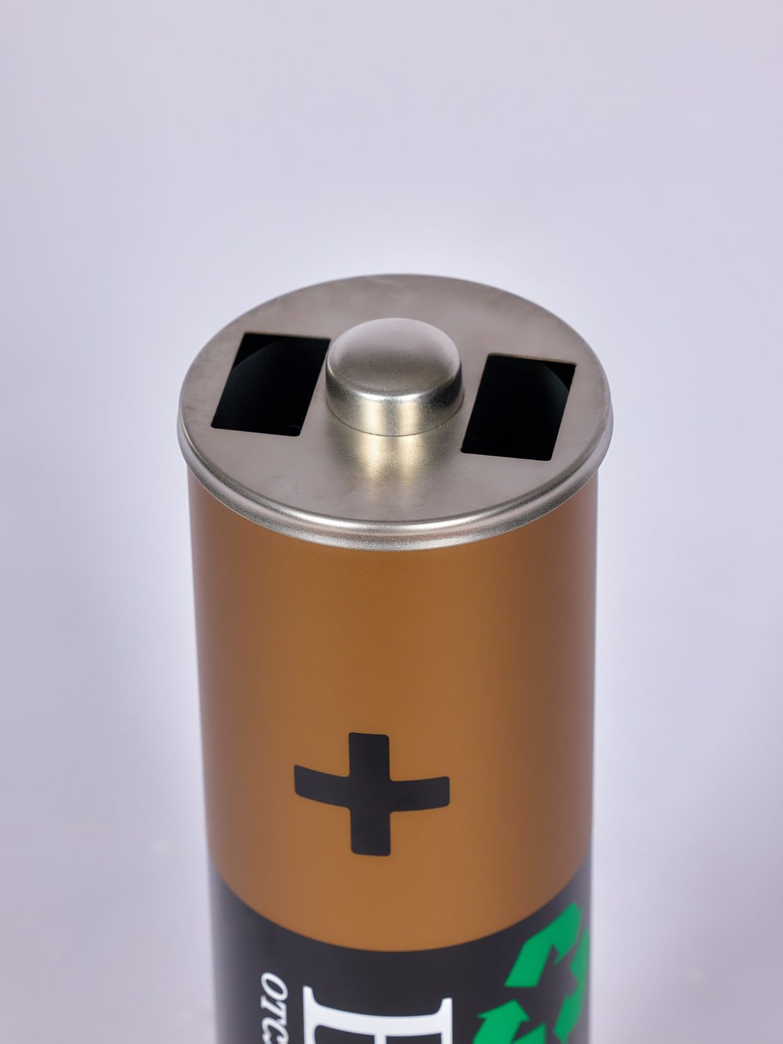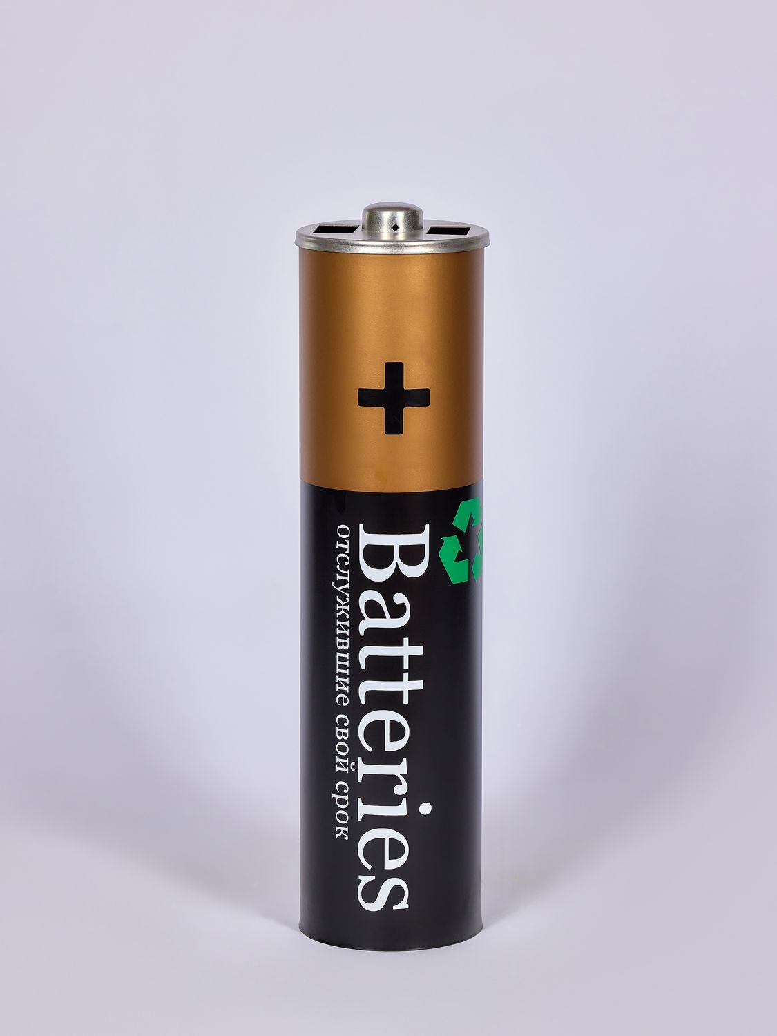 Урна по виду и форме напоминает большую батарейку, что еще раз акцентирует внимание на том, для чего и с какой целью использовать емкость.