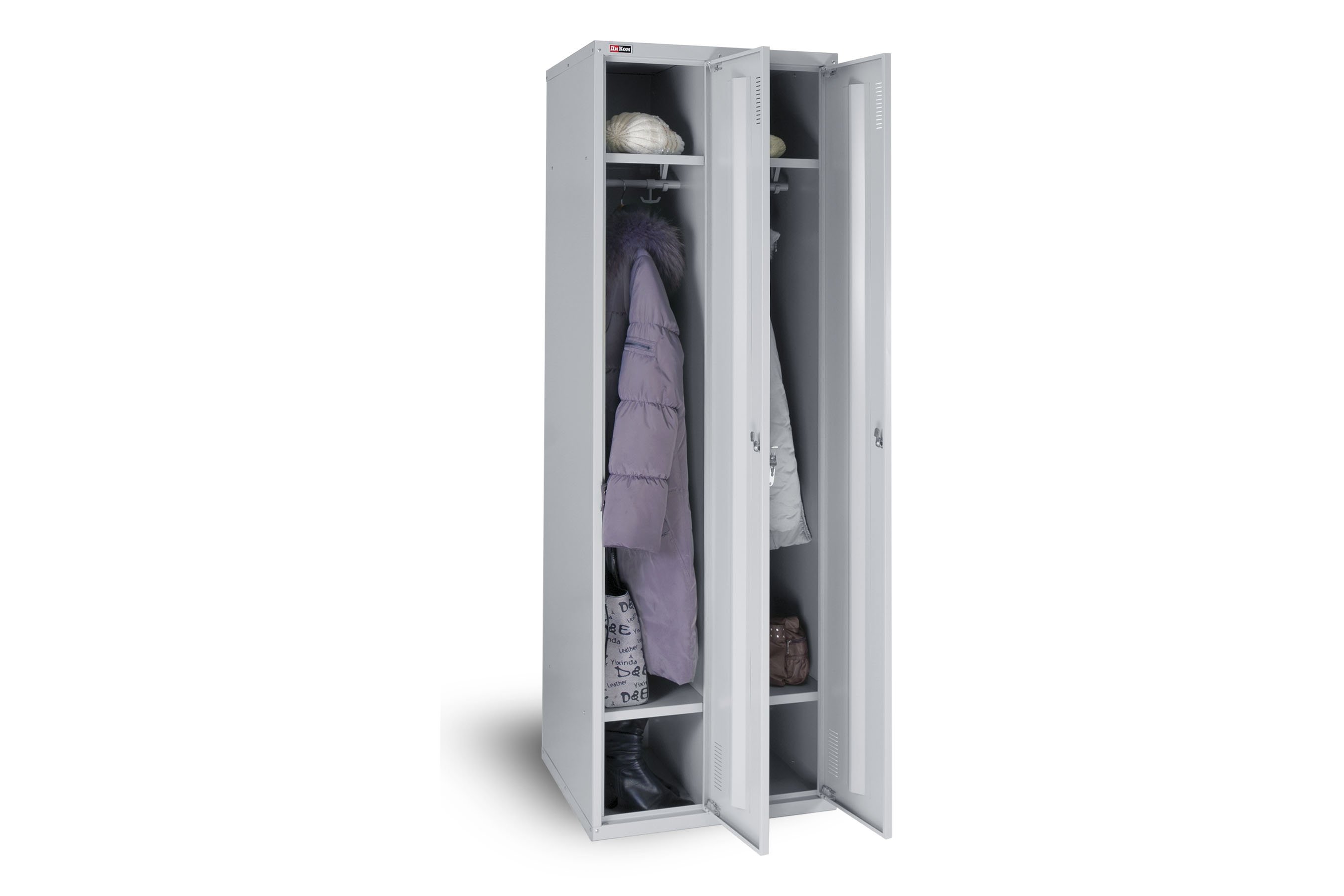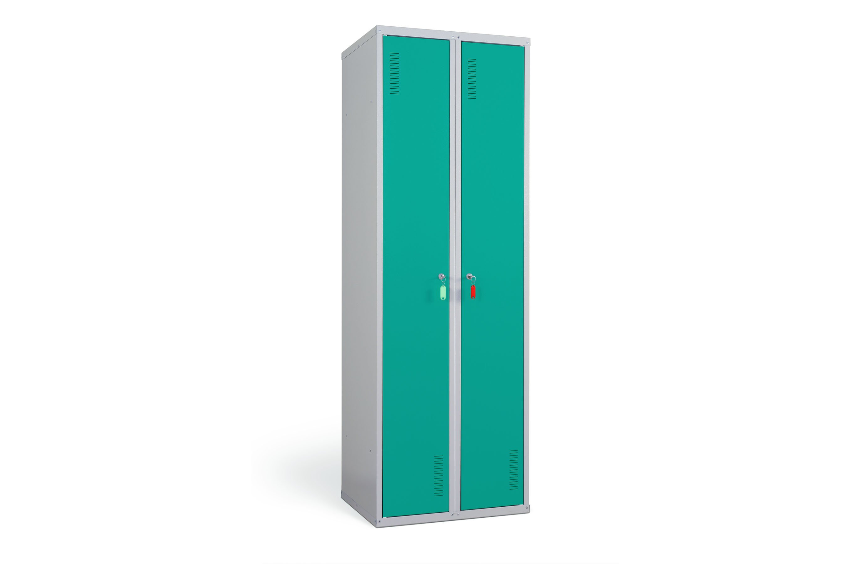 Шкаф предназначен для двух человек. Каждое отделение закрывается на свой ключ. Ячейка шкафа оснащена полкой под головной убор и перекладиной с двумя крючками. По желанию можно установить нижнюю полку под обувь.