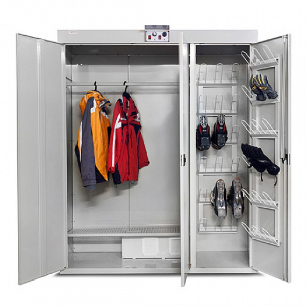 Данная модель сушильного шкафа предназначена для сушки восьми комплектов одежды, спецодежды (что включает в себя: 8 комплектов одежды, 8 пар обуви, 8 пар перчаток), шкаф надежно закрывается ключом.
