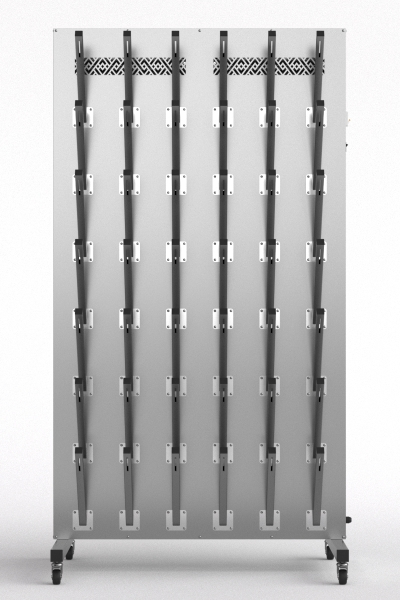 Cушильное устройство предназначено для просушки 42 пар обуви и перчаток. Данные сушилки используются внутри помещений на предприятиях пищевой, нефтегазовой и других отраслях промышленности и животноводства.Так же находят применение в строительных, транспортных, судоходных компаниях, образовательных учреждениях. Встроенная УФ-лампа позволяет устранить неприятные запахи, оказывает дезинфицирующее действие. Сборка происходит путем прикручивания винтами воздуховодов и ножек к сушильному модулю. Подключается к бытовой розетке.