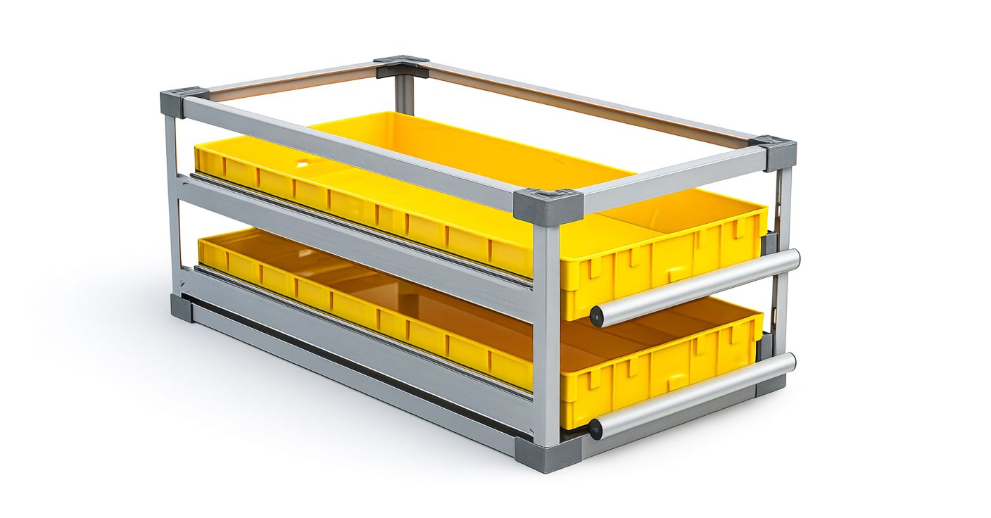 Модуль имеющий собственный силовой каркас с двумя ящиками-трансформерами. Распределенная нагрузка каждого ящика до 25 кг. Размещение до 16 наименований товара изолированно друг от друга (по 8 наименований в каждом ящике). Глубина (выдвинутая) - 1910 мм