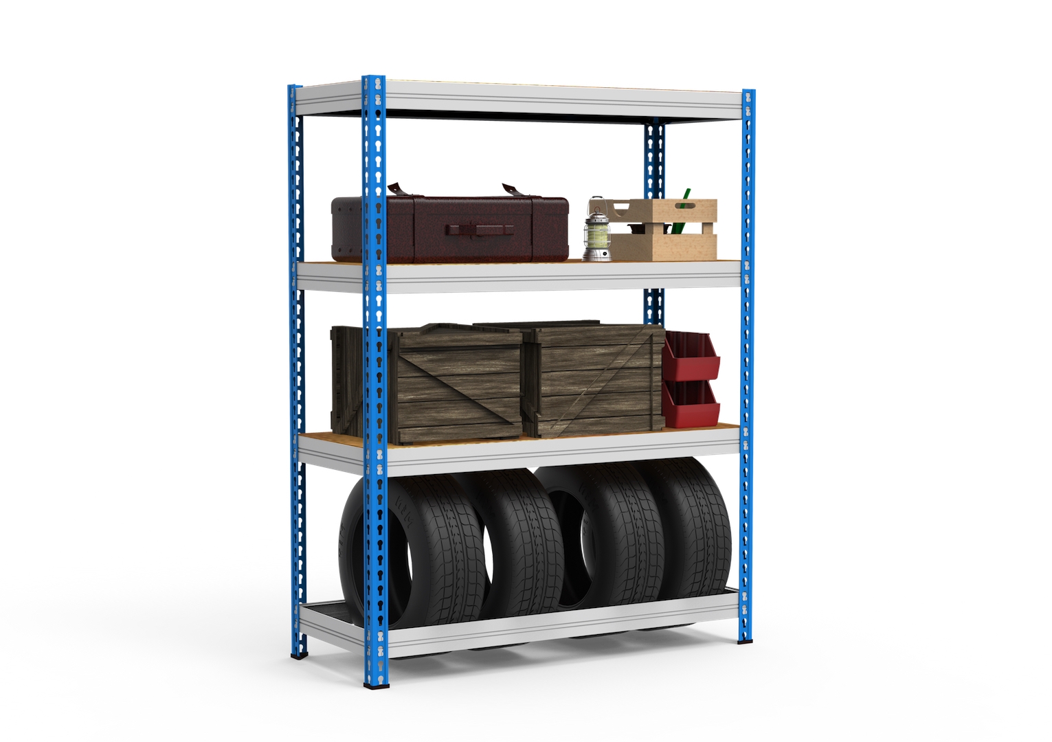 - Стеллажи полочные, сборно-разборные. Особенности конструктивного исполнения стеллажа позволяют производить сборку без дополнительных крепежных элементов. Профиль балки МКФ позволяет использовать стеллаж в двух вариантах: одна сторона предназначена для настила, другая – для хранения автомобильных колес. В первом варианте каждая полка (ярус) состоит из продольных и поперечных) балок, на которых размещается усиленная фанера, во втором варианте – только продольные и поперечные балки. Балки стеллажа крепятся к стойкам при помощи двух замков с зацепами. Стеллажи с представленными размерами позволяют хранить колеса радиусом от 13” и выше.