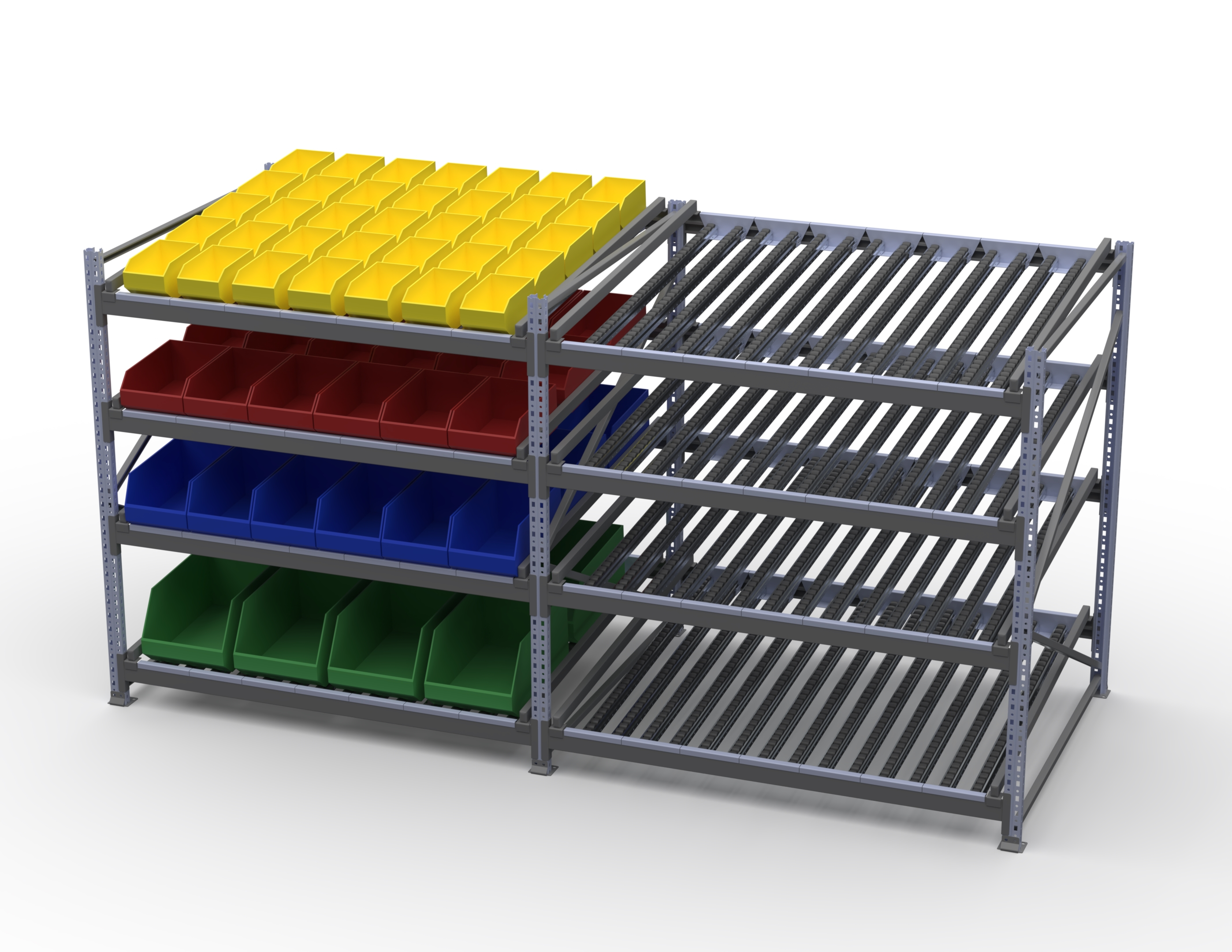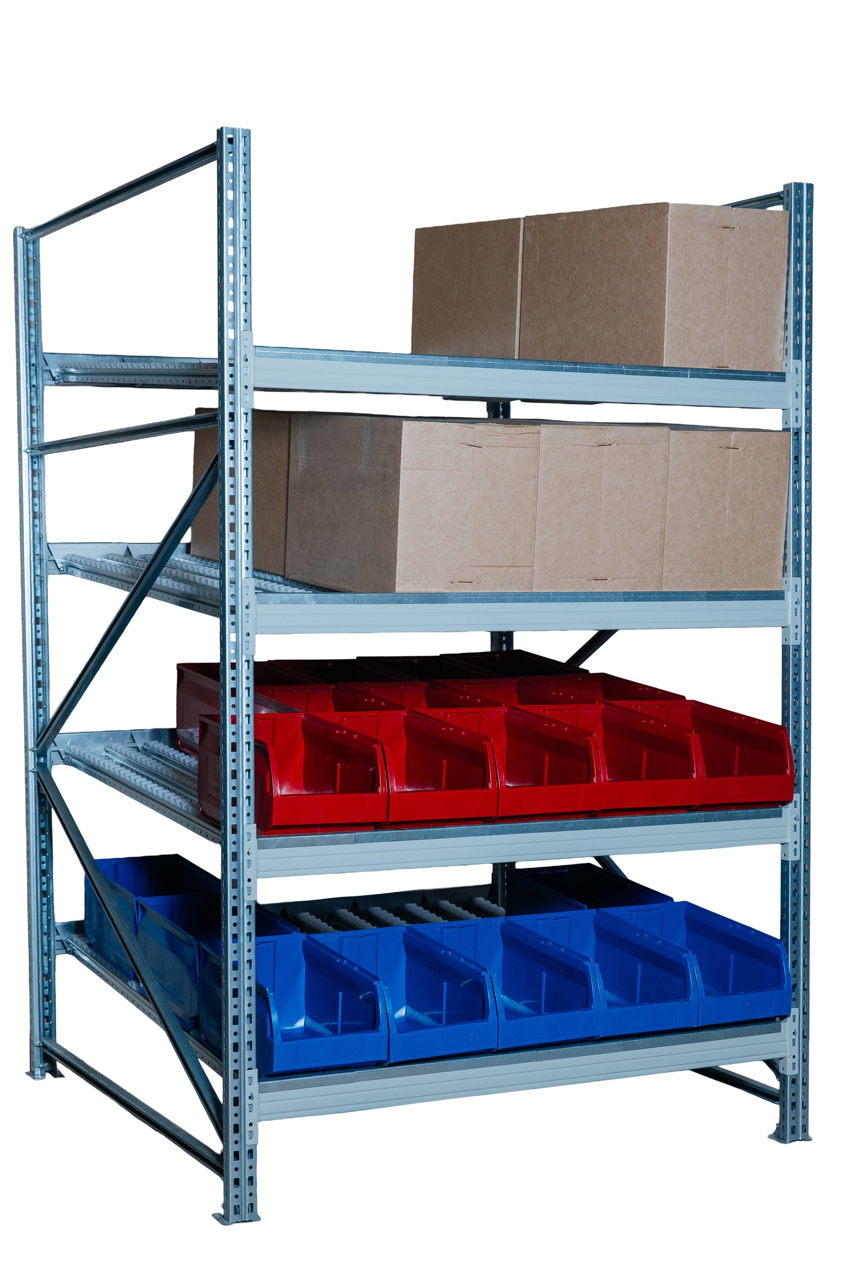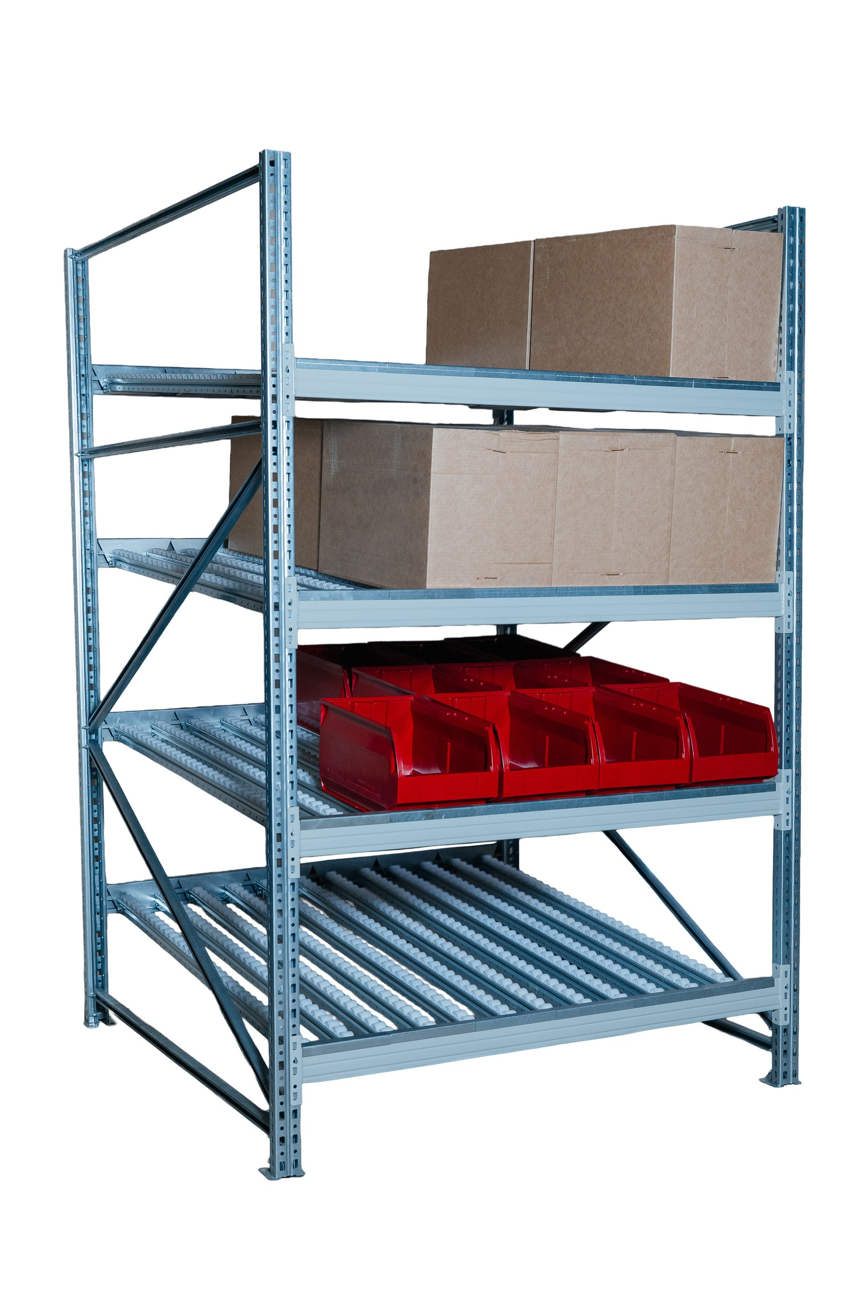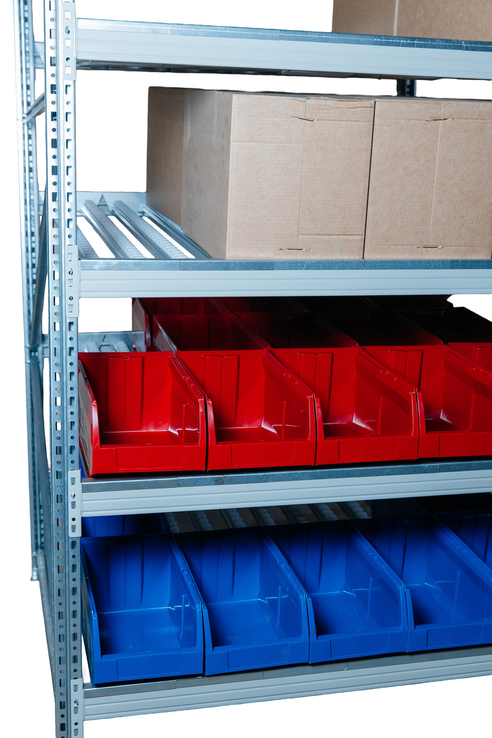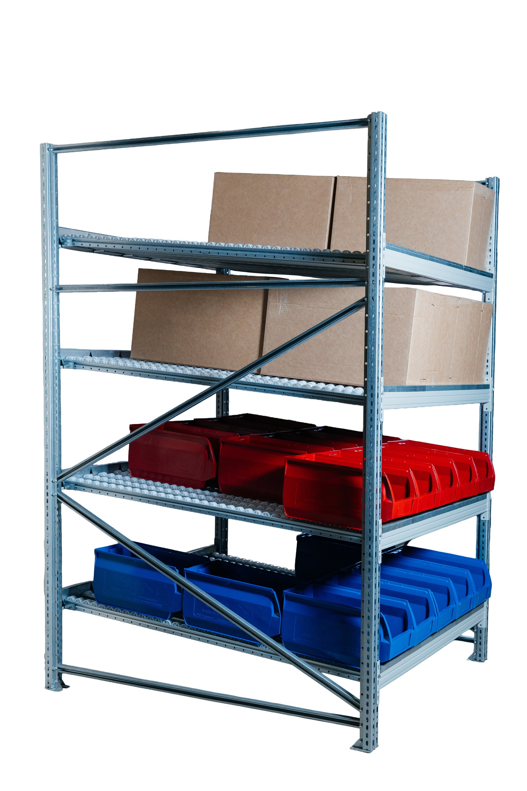 За счёт роликовых полок и наклонной подачи тары стеллаж поддерживает FIFO-принцип хранения, при котором загруженный товар последовательно перемещается к зоне отбора. Это позволяет ускорить комплектацию заказов, повысить наглядность размещения продукции и оптимизировать использование рабочего пространства.