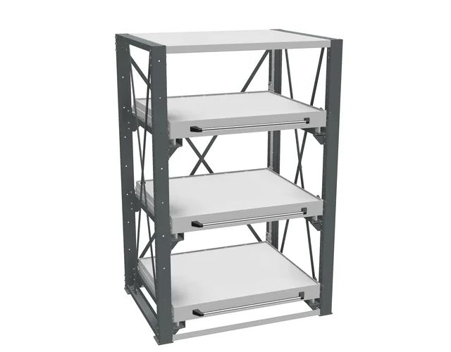 Стеллаж для хранения тяжелой нагрузки. Одна секция укомплектована тремя платформами ВТ 1200 (максимальная нагрузка на платформу 1200 кг), а также ВТ Полкой. Максимальная нагрузка на секцию стеллажа — до 5000 кг.