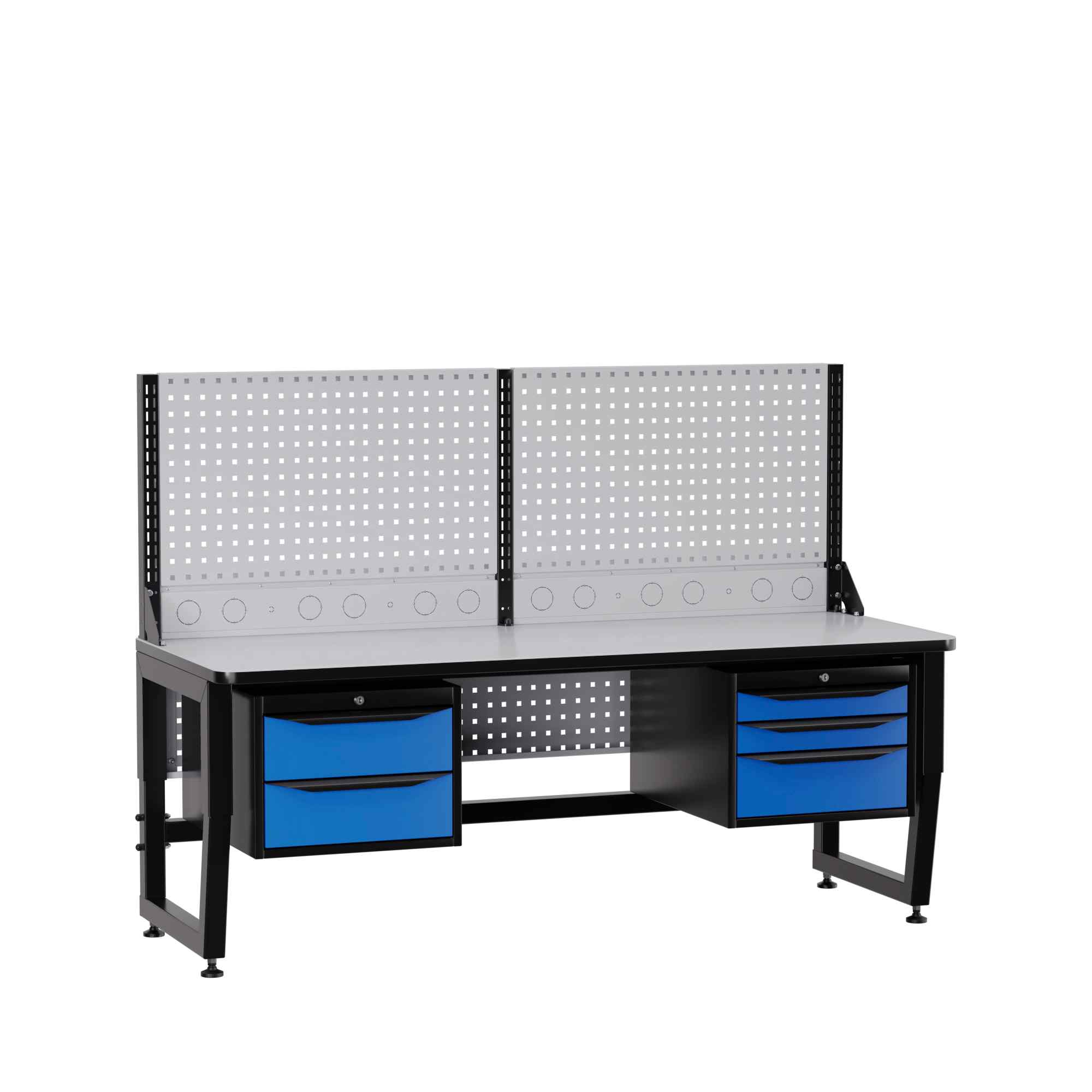 Несущая конструкция стола – это промышленный ESD каркас. Сочетание опорных, несущих и усиливающих элементов из металла, обеспечивают высокую надежность конструкции при интенсивной промышленной эксплуатации с распределенными нагрузками на рабочее место до 300 кг. Регулируемые опоры с возможностью плавной регулировки по высоте позволяют установить удобную высоту рабочей поверхности от 700мм до 850мм. Специальное ESD полимерное покрытие элементов каркаса с сопротивлением 1 МОм обеспечивают антистатические свойства изделия