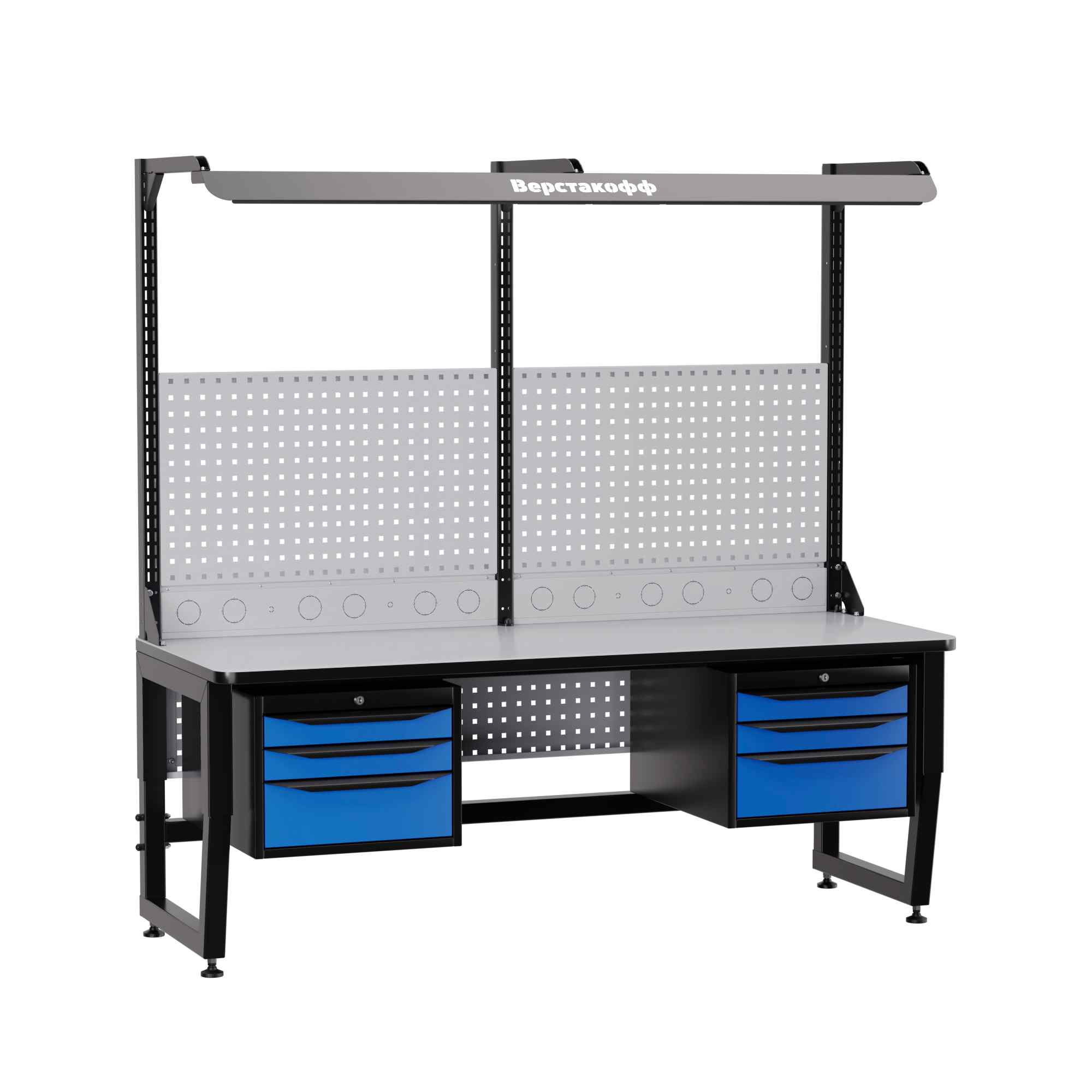 Для наилучшей освещенности при работе с мелкими электронными компонентами рабочее место комплектуется блоком освещения. В его составе - специальный промышленный светильник с необходимой цветовой температурой и световым потоком, обеспечивающим оптимальные условия работы. Блок освещения располагается над рабочей поверхностью на регулируемых (по высоте и по вылету) кронштейнах