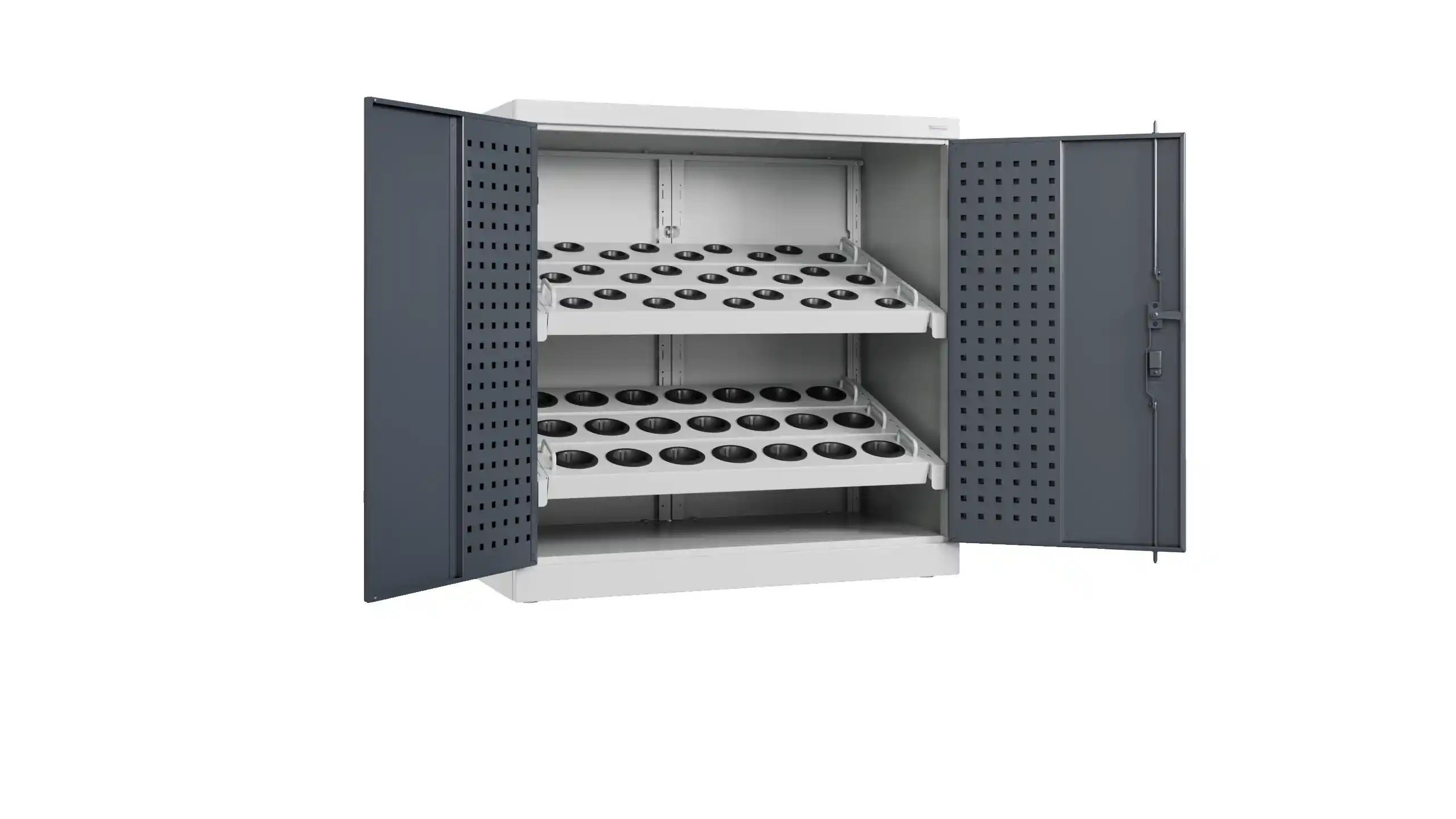 Двери имеют усиливающие профильные рёбра с внутренней части, на рёбрах имеется перфорация в виде квадратных отверстий 12х12 мм и шагом 38 мм. Каждая дверь устанавливается на корпус шкафа при помощи трёх петель с открыванием на 180 гр. Замок двери имеет секретность 2000 комбинаций.