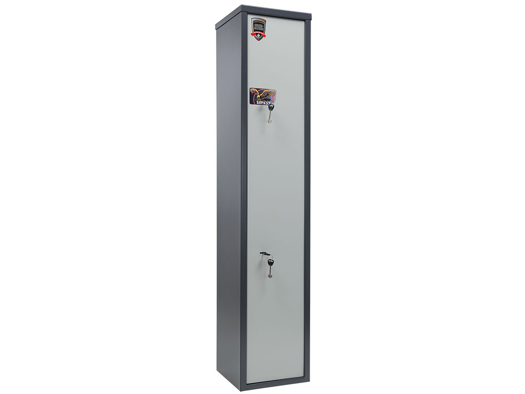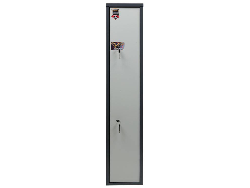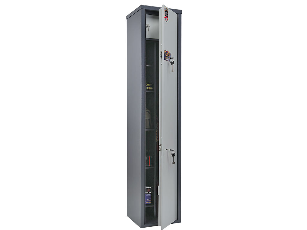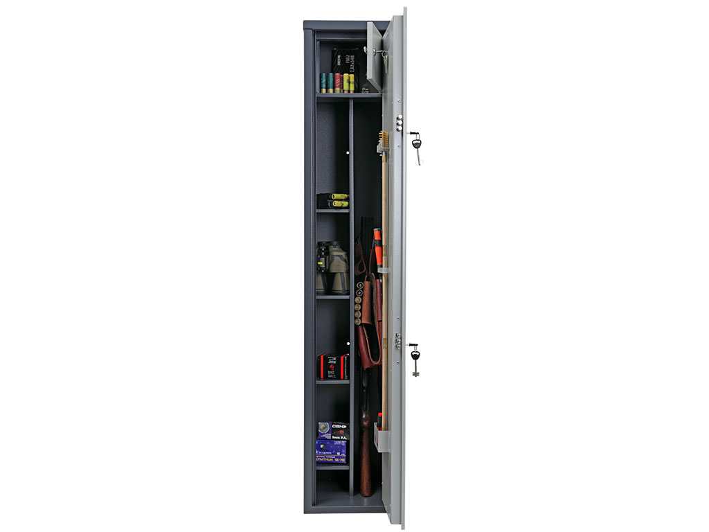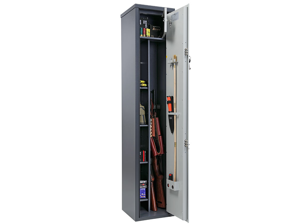Толщина металла корпуса и двери – 2 мм оборудованы патронным отделением, запирающимся на ключ, полками и ложементами для ружей
