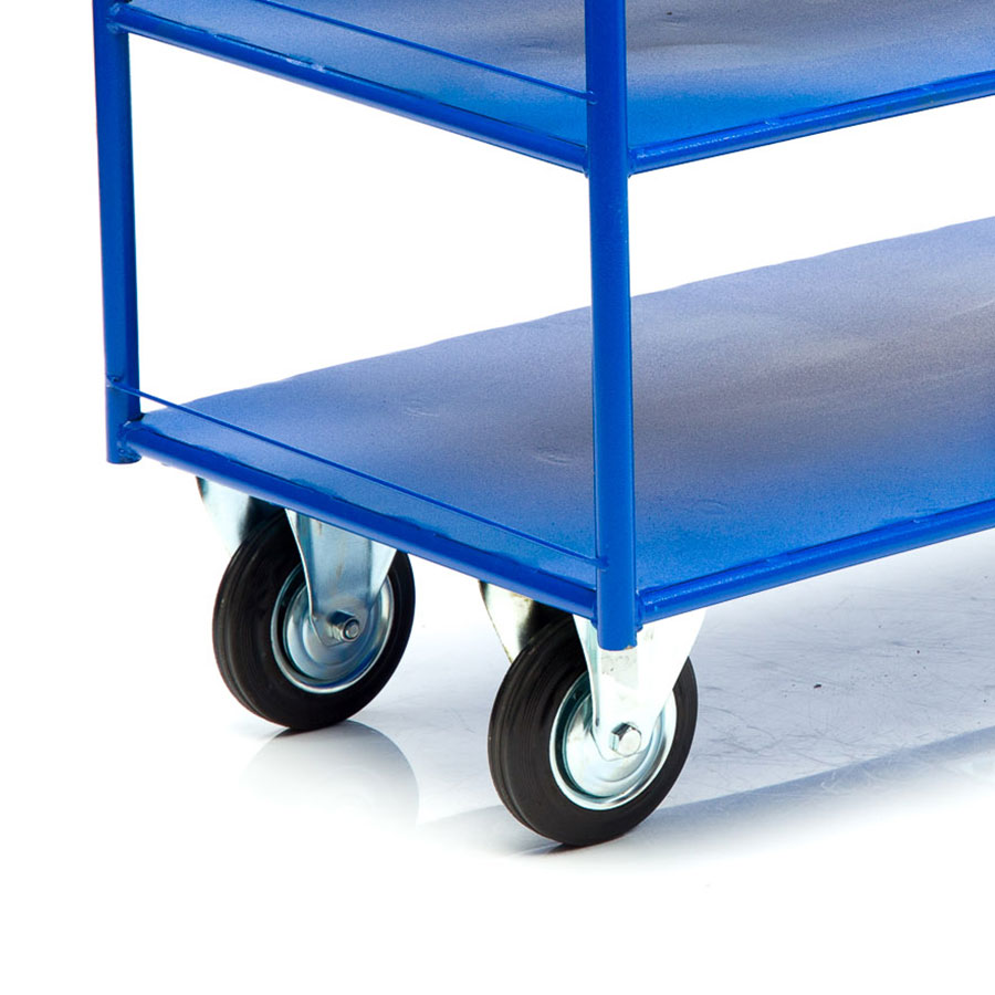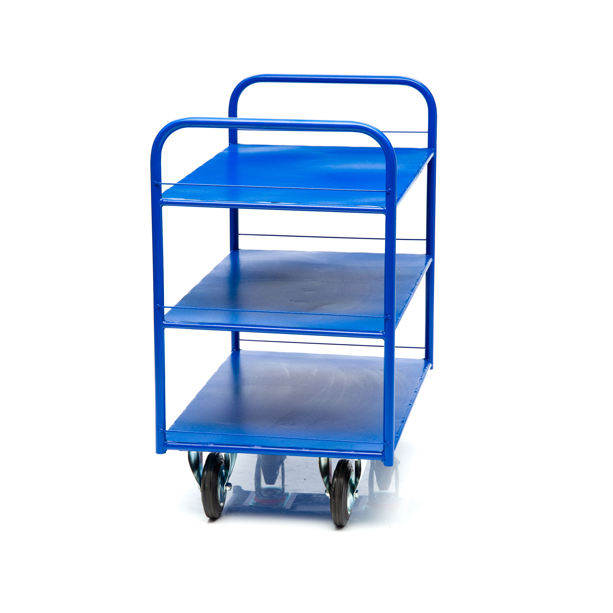 Платформенная трехъярусная 4-х колесная тележка КР-3 предназначена для перевозки малогабаритных грузов. Платформа металлическая толщина листа 1,2мм. Размер платформы 600х900мм. Расстояние между ярусами 300мм. Количество ярусов 3 шт. Габаритная высота 1000мм. Покрытие полимерное. Цвет синий, шагрень. Тележка КР-3 оснащена двумя поворотными и двумя неповоротными колесами, изготовленными из высококачественной литой резины, что обеспечивает простоту и легкость перемещения тележки. Благодаря наличию трех ярусов, тележка широко используется на складах, в торговых павильонах, а также в гостиничном и ресторанном бизнесе.