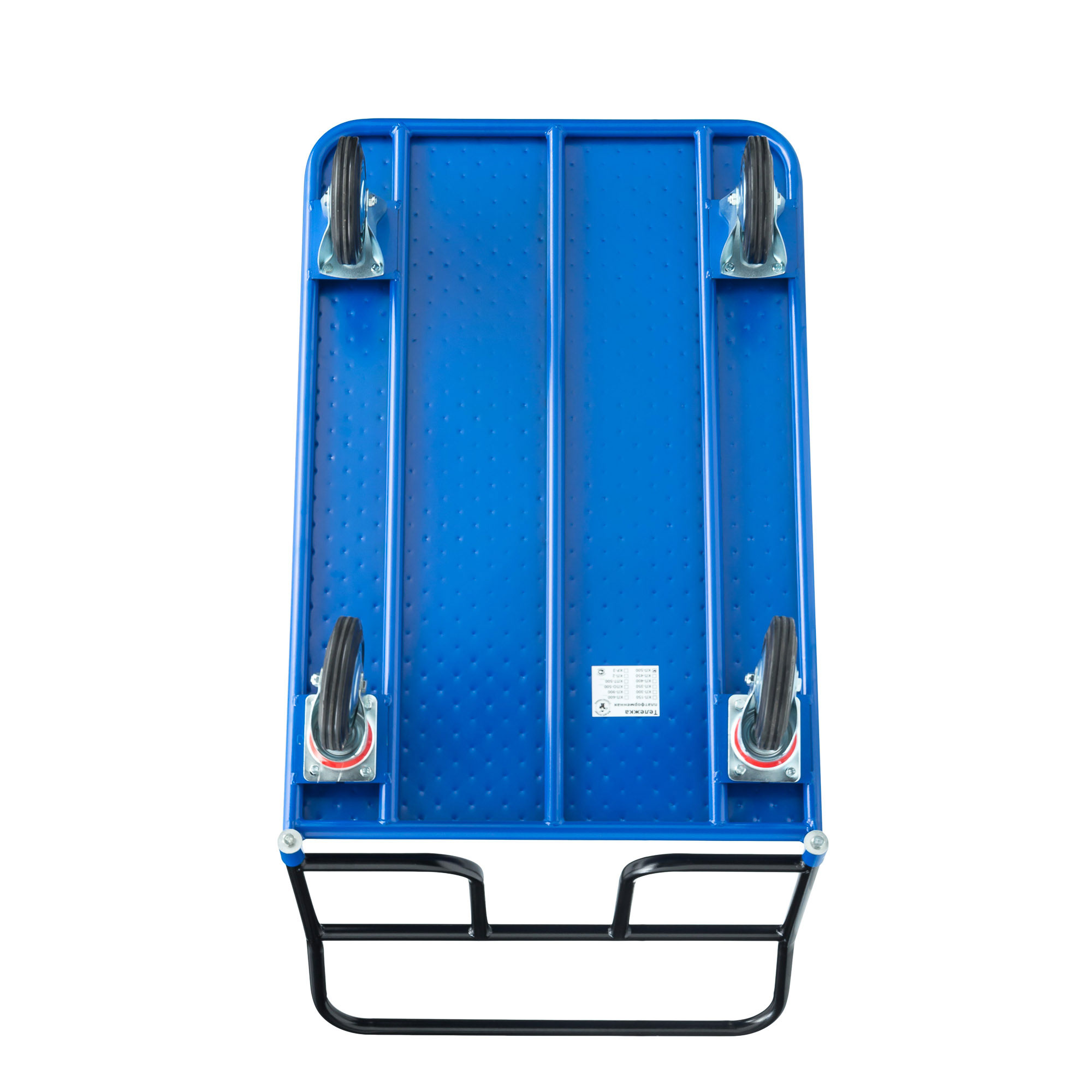 Платформенная 4-х колесная тележка КП-400 (700х1000) используется для перемещения различных грузов в складских помещениях. Ручка крепится к платформе болтами, для компактного хранения можно снять, высота ручки 750мм. Платформа имеет уникальную рельефную, полимерную, противоскользящую поверхность. Цвет синий, шагрень. Для легкого перемещения тележка КП-400 комплектуется 2 поворотными и 2 неповоротными колесами, изготовленными из высококачественной литой резины.