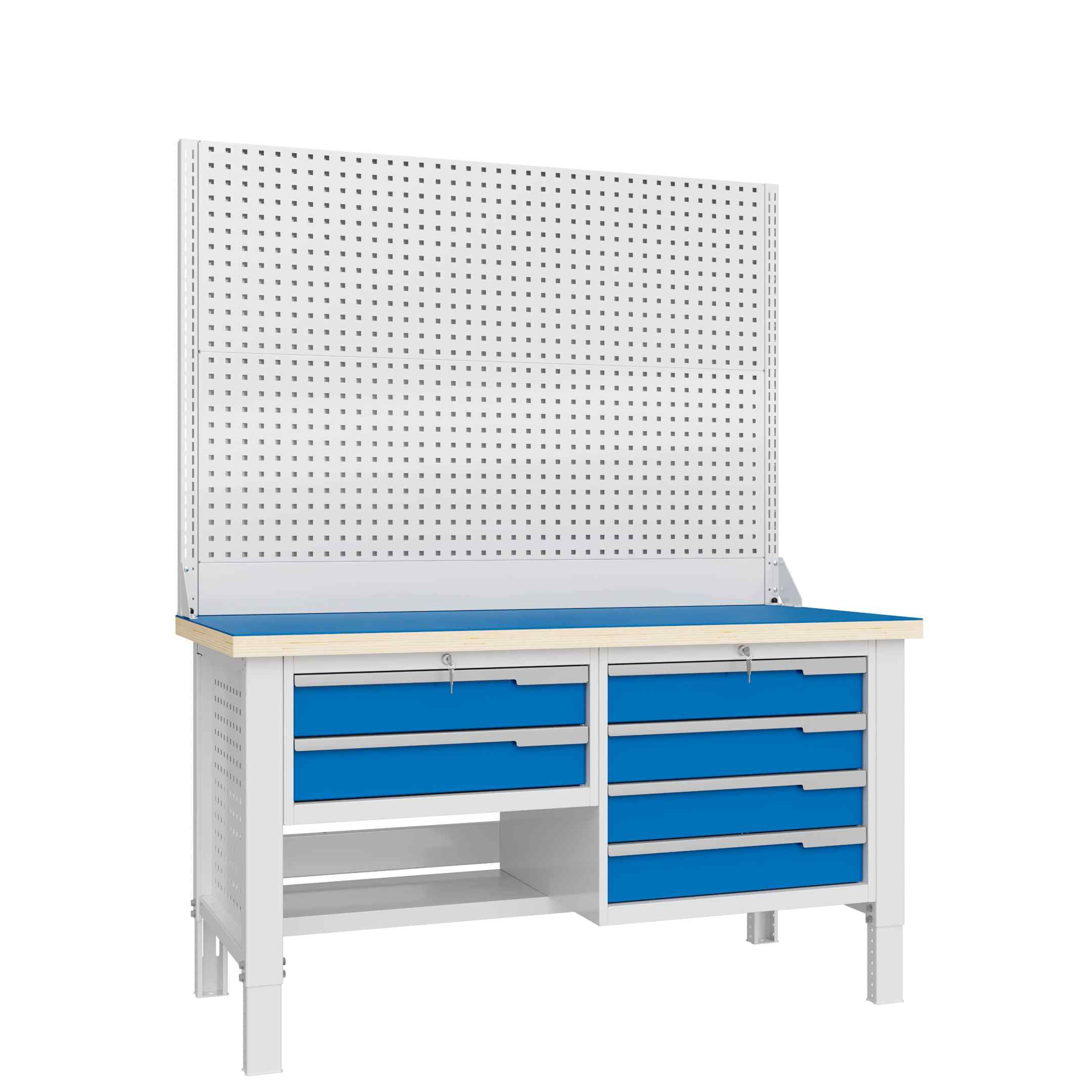 Регулировка рабочего места по высоте осуществляется в диапазоне от 700 до 950мм с шагом 25мм. Предусмотрена возможность тонкой регулировки усиленным резьбовым подпятником. Нагрузка на ящики верстака - до 40 кг, на полки - до 60кг. Общая распределенная нагрузка на рабочую поверхность 1500кг. Имеет возможность стыковки в единую рабочую поверхность с верстаками серии Constructor