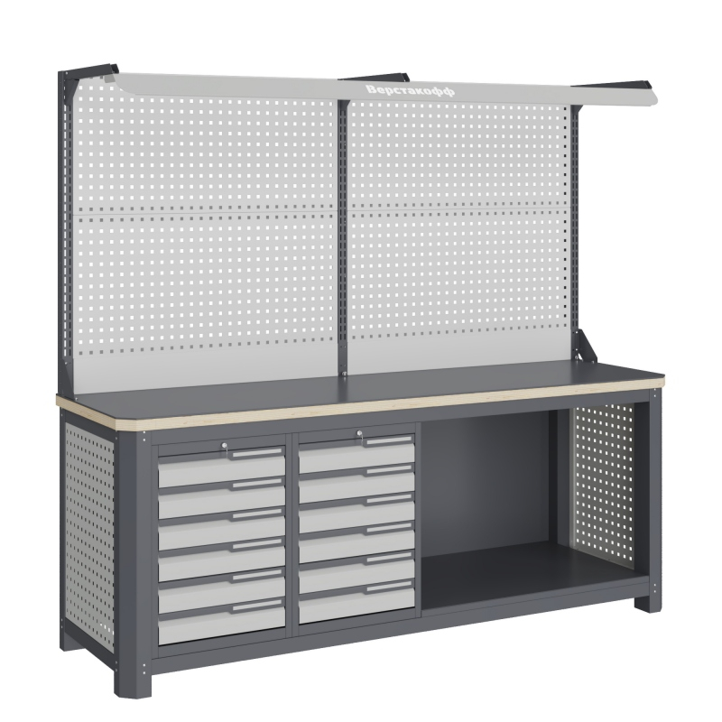 Верстак серии MECHANIC: MCN 2052.S66.11-2F состоит из столешницы шириной 1993 мм, рамы верстака, состоящей из опор, перемычек, боковых перфопанелей, двух малых модулей S6 и двух комплектов полка-стенка SW1, двойного экрана с кронштейнами и комплектом навесок.