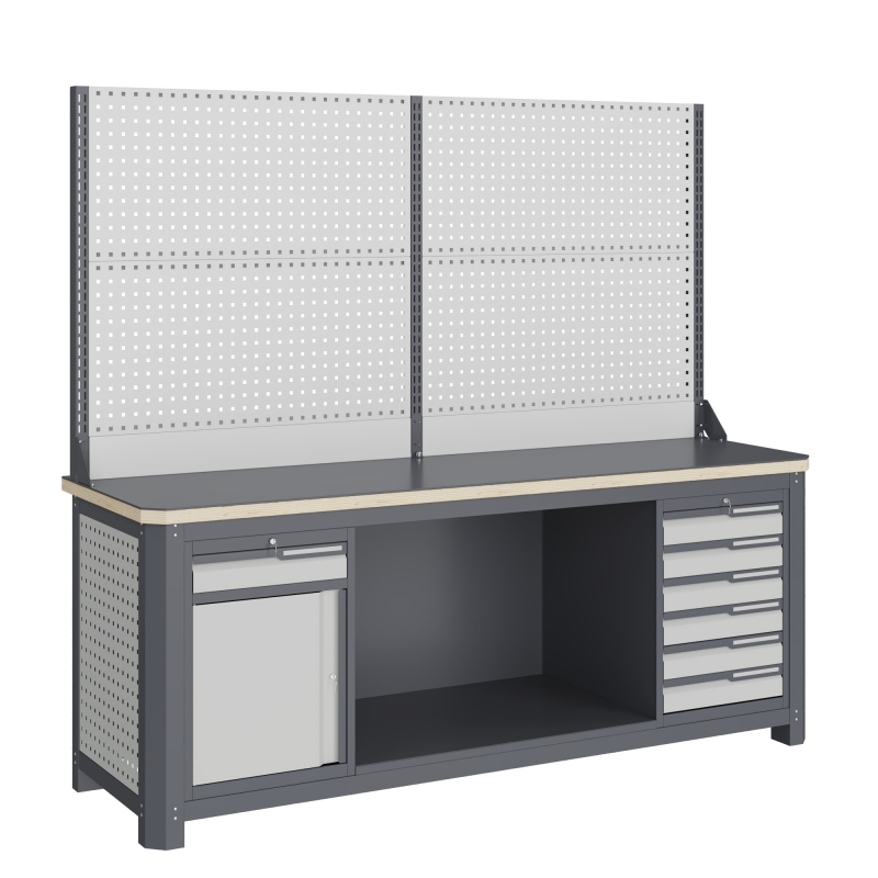 Верстак серии MECHANIC: MCN 2052.S68.11-2 состоит из столешницы шириной 1993 мм, рамы верстака, состоящей из опор, перемычек, боковых перфопанелей, малых модулей S6, S8 и двух комплектов полка-стенка SW1, двойного экрана с кронштейнами.