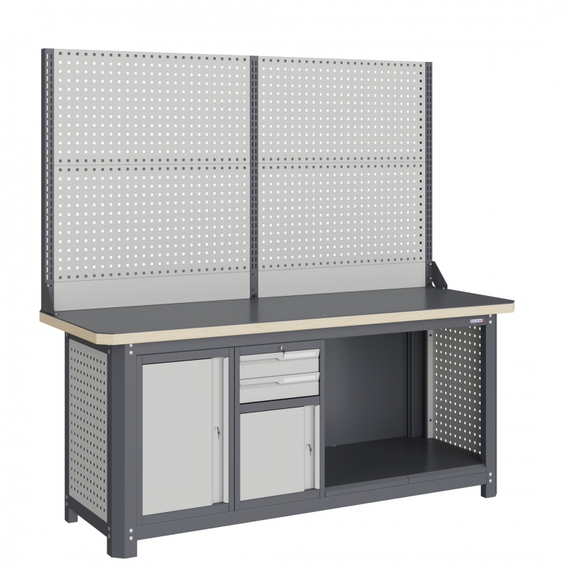 Экран (перфорированная панель) верстака выполнен с квадратной перфорацией 12х12 мм с шагом 38 мм для установки крючков, держателей и других аксессуаров. Экран крепятся к столешнице с помощью специальных кронштейнов. Максимальная масса груза, равномерно распределенного по поверхности экрана, составляет 71 кг.