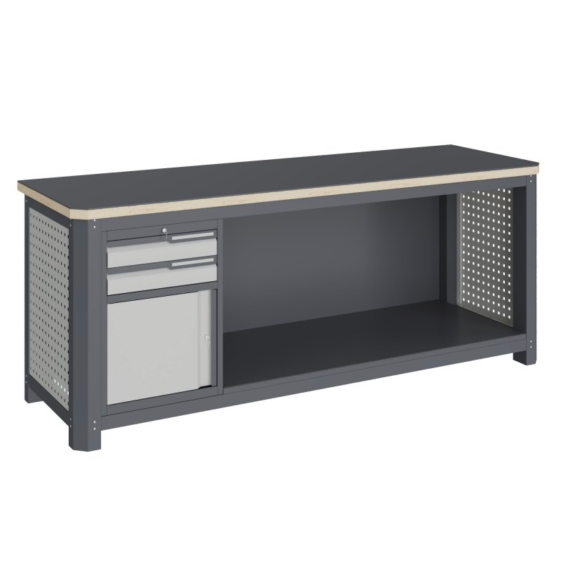 Верстак серии MECHANIC: MCN 2052.S9.111 состоит из столешницы шириной 1993 мм, рамы верстака, состоящей из опор, перемычек, боковых перфопанелей, малого модуля S9 и трех комплектов полка-стенка SW1.