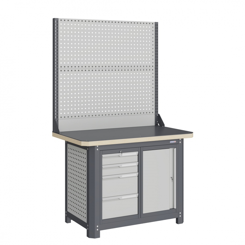 Верстак серии MECHANIC: MCN 1252.S47-2 состоит из столешницы шириной 1193 мм, рамы верстака, состоящей из опор, перемычек, боковых перфопанелей, малого модуля S4, малого модуля S7, двойного экрана с кронштейнами.
