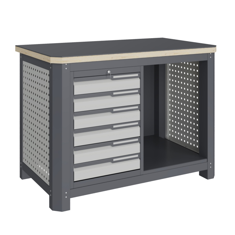 Верстак Верстакофф ® MECHANIC: MCN 1252.S6.1 состоит из столешницы шириной 1193 мм, рамы верстака, состоящей из опор, перемычек, боковых перфопанелей, небольшого модуля с ящиками S6, комплекта полка-стенка SW1.