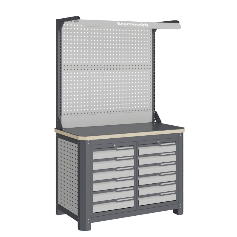 Рабочее место MECHANIC: MCN 1252.S66-2F состоит из столешницы шириной 1193 мм, рамы верстака, состоящей из опор, перемычек, боковых перфопанелей, двух небольших модулей с ящиками S6, двойного экрана с кронштейнами и комплектом освещения.