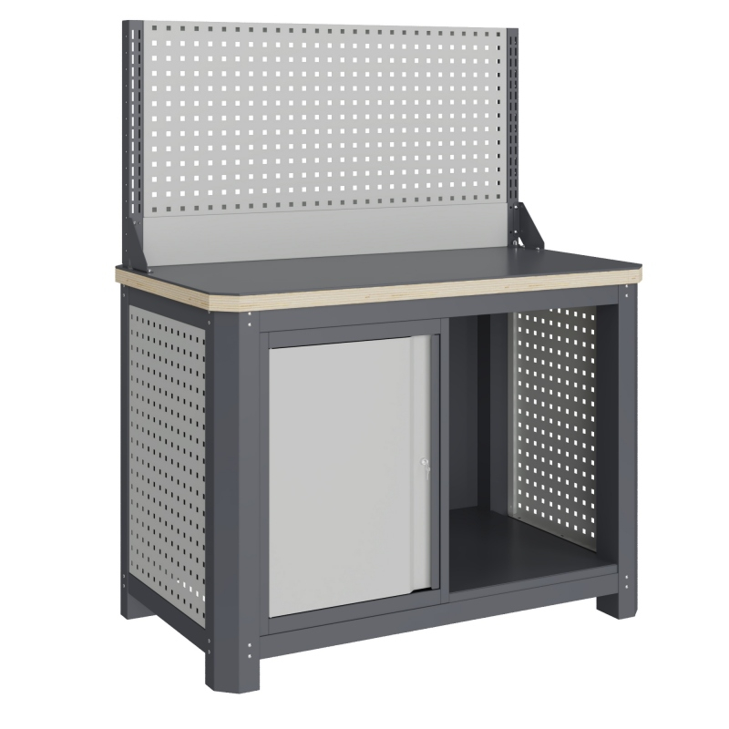 Экран (перфорированная панель) верстака выполнен с квадратной перфорацией 12х12 мм с шагом 38 мм для установки крючков, держателей и других аксессуаров. Экран крепятся к столешнице с помощью специальных кронштейнов. Максимальная масса груза, равномерно распределенного по поверхности экрана, составляет 71 кг.