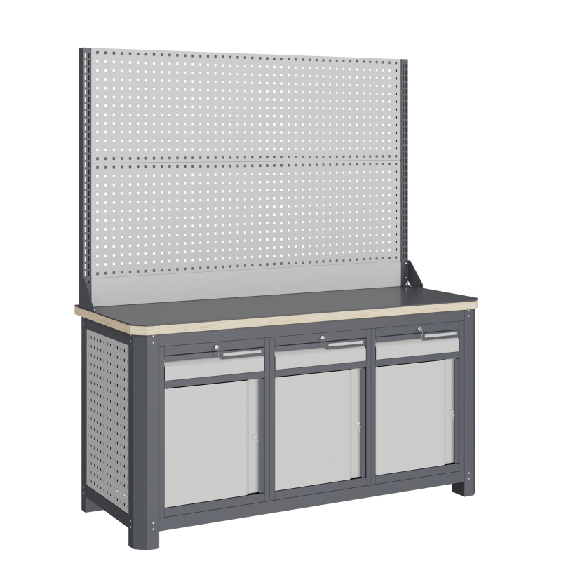 Верстак серии MECHANIC: MCN 1552.S888-2 состоит из столешницы шириной 1493 мм, рамы верстака, состоящей из опор, перемычек, боковых перфопанелей, четырех малых модулей S8, двойного экрана с кронштейнами.