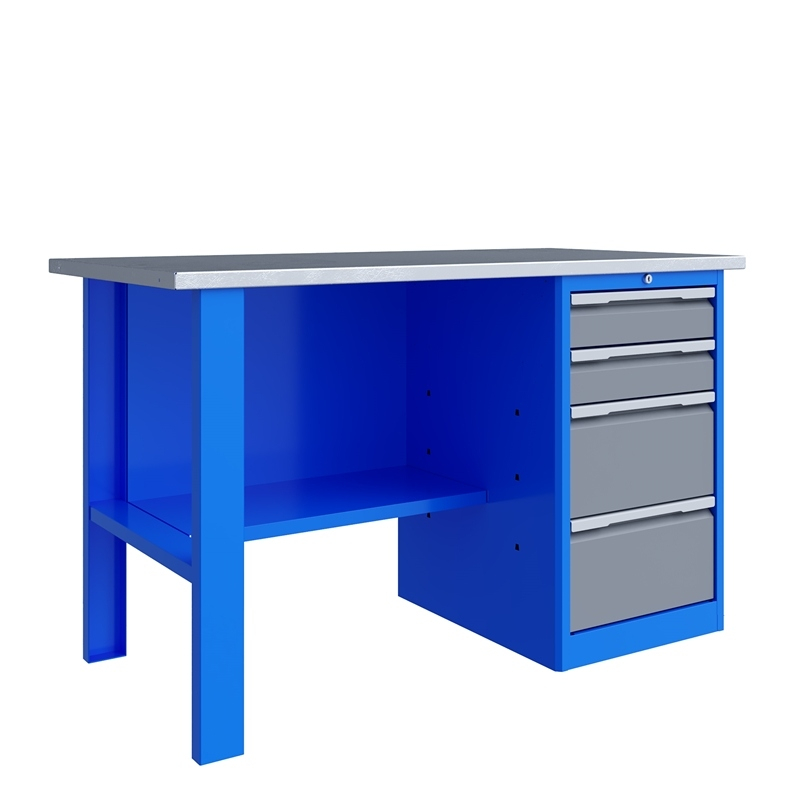 Верстак серии Technic 141.14.2 состоит из столешницы шириной 1396 мм, опоры, тумбы P4 с двумя малыми и двумя большими ящиками и полки-стенки.