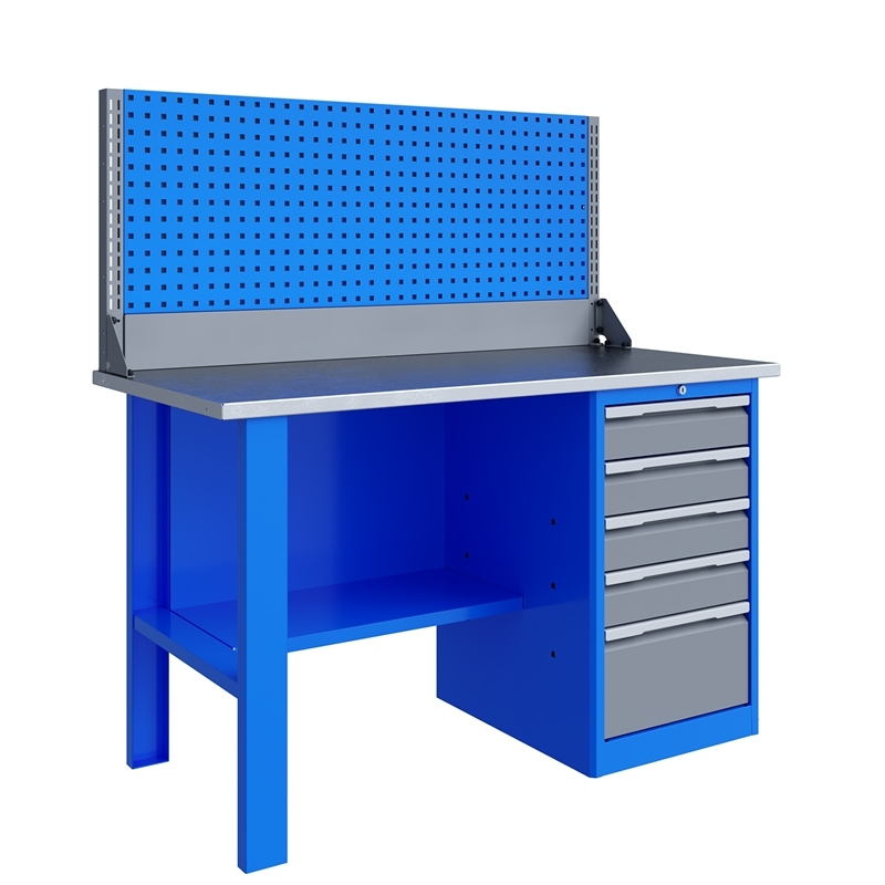 Верстак серии Technic 141.15.2-1 состоит из столешницы шириной 1396 мм, опоры, тумбы P5 с четырьмя малыми и одним большим ящиком, полки-стенки и одинарного экрана с кронштейнами.