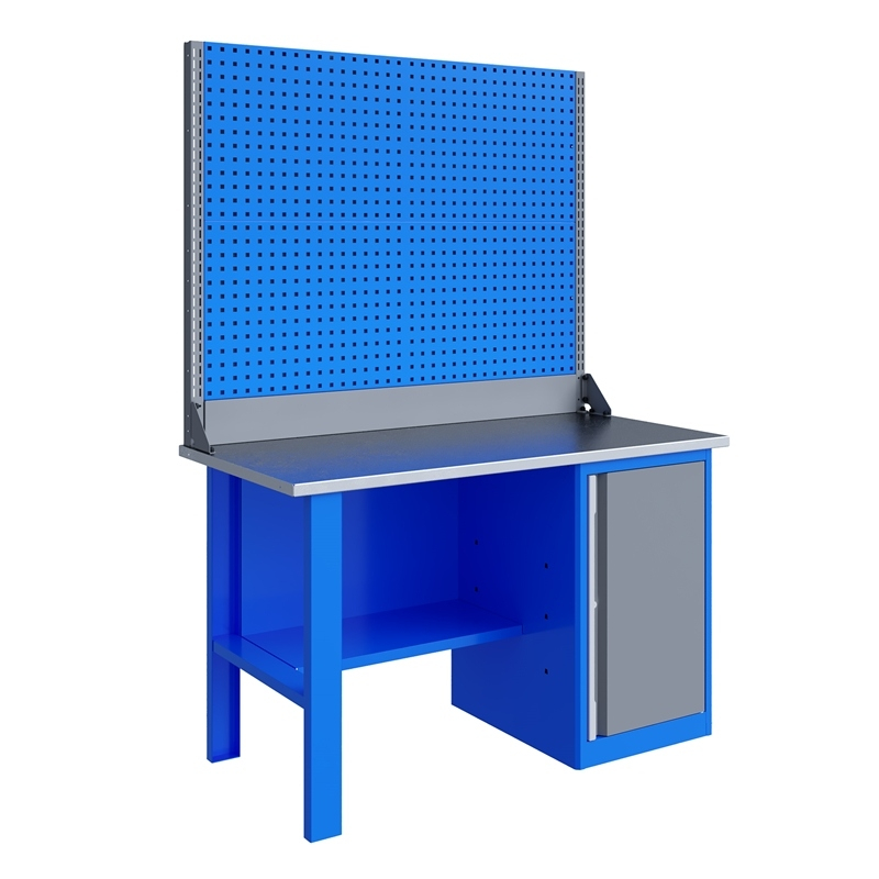 Двойной экран (перфорированные панели) верстака выполнен с квадратной перфорацией 12х12 мм с шагом 38 мм для установки крючков, держателей и других аксессуаров. Экран крепится к столешнице с помощью специальных кронштейнов. Максимальная масса груза, равномерно распределенного по поверхности экрана, составляет 100 кг.