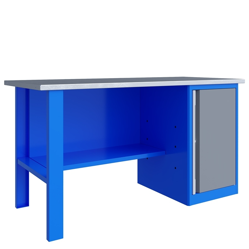 Верстак серии Technic 161.17.3 состоит из столешницы шириной 1596 мм, опоры, тумбы P7 с дверью и двумя полками и полки-стенки.