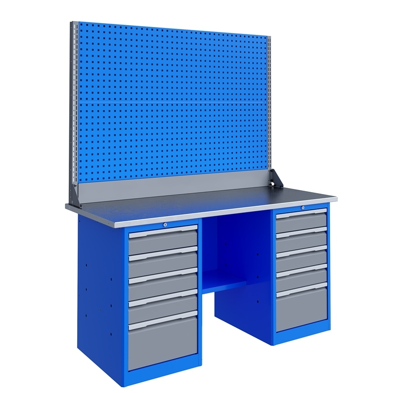 Верстак серии Technic 161.55.1-2 состоит из столешницы шириной 1596 мм, двух тумб P5 с четырьмя малыми и одним большим ящиком, двойного экрана с кронштейнами