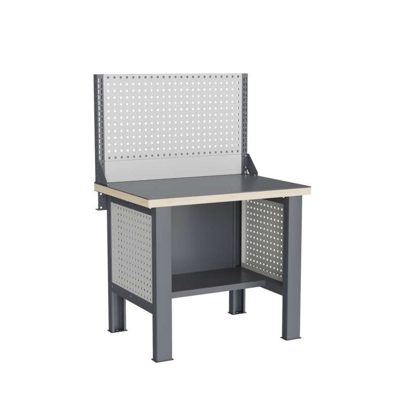 Верстак может комплектоваться одинарным или двойным перфорированным экраном, электромонтажным блоком для установки розеток и дополнительных устройств, а также комплектом освещения с держателем и лампой. Перфорация экрана подходит под стандартные держатели для инструментов, отверток, крючков, полок. Возможна комплектование верстака навесным элементами (держатели, крючки, полки).