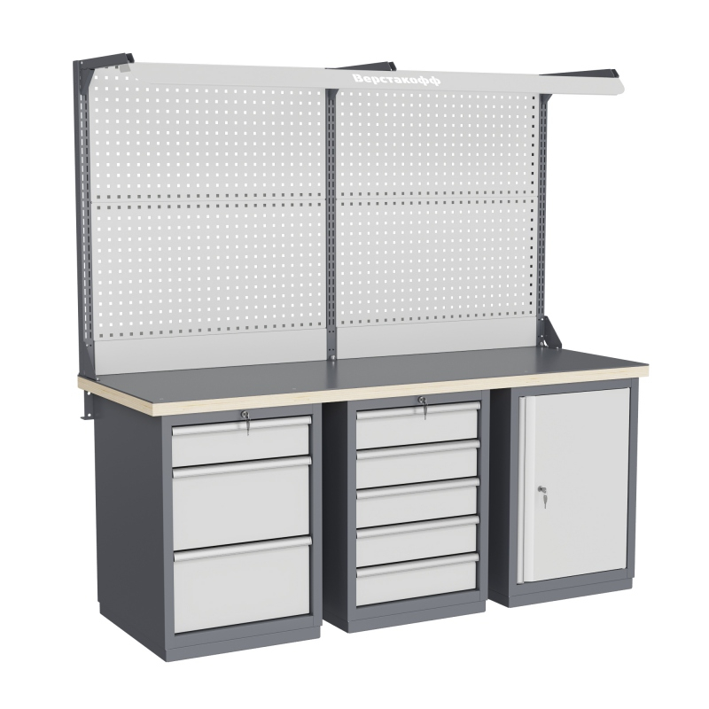 Верстак может комплектоваться одинарным или двойным перфорированным экраном, электромонтажным блоком для установки розеток и дополнительных устройств, а также комплектом освещения с держателем и лампой. Перфорация экрана подходит под стандартные держатели для инструментов, отверток, крючков, полок. Возможна комплектование верстака навесным элементами (держатели, крючки, полки).